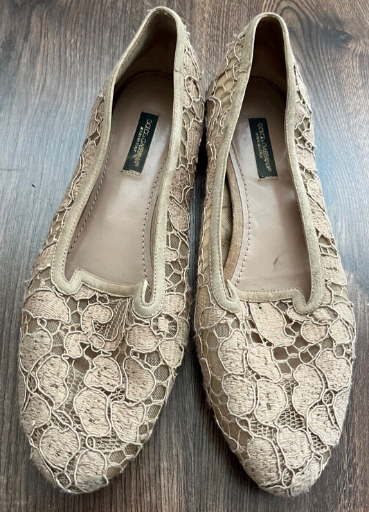 Dolce Gabbana Beige Floral Lace Loafers Flats Shoes Women Size 37 Made in Italy